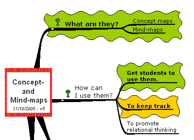 As appropriated by Tony Buzan (who seems to think he invented them; "mind mapping" is a apparently a registered trademark of the Buzan organisation), these are concept maps branching from a single central node; they are not as flexible as concept maps, but may be easier to manage by students in lectures, which notionally start from a single topic. [Back]