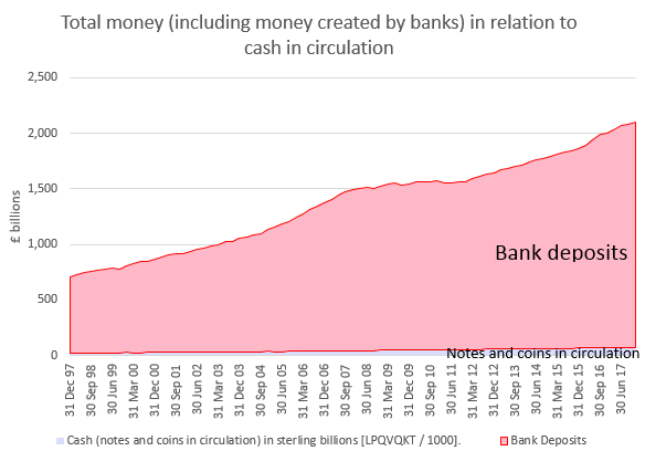 [1] Notes and coins in circulation held outside the banking system by the non-bank private sector comprise the liabilities of the Bank of England (bank notes) and government (coins in circulation), but excludes the notes and coins held by the commercial banking system within their tills and cash machines. Data relating to notes and coins in circulation is acquired from the Bank of England dataset ‘quarterly amounts outstanding of M4 private sector sterling holdings of notes and coin (in sterling billions) not seasonally adjusted’ [which is dataset LPQVQKT]. Sterling M4ex (excluding intermediate OFCs (other financial corporations)) measures broad money in circulation by presenting the deposit liabilities of banks and building societies, whilst excluding commercial bank reserves held at the Bank of England. Sterling M4ex was acquired from Bank of England dataset ‘quarterly amounts outstanding of UK resident monetary financial institutions' sterling M4 liabilities to Private sector excluding intermediate OFCs (in sterling billions) not seasonally adjusted’ [Bank of England dataset RPQB3DQ] to calculate the total amount of money in circulation for the purpose of calculating the total value of commercial bank credit money (liabilities of commercial banks). The total value of commercial bank credit money is obtained by calculating the difference between these two values.