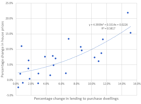 Figure 8: Percentage change in house prices in relation to percentage change in lending to purchase dwellings.