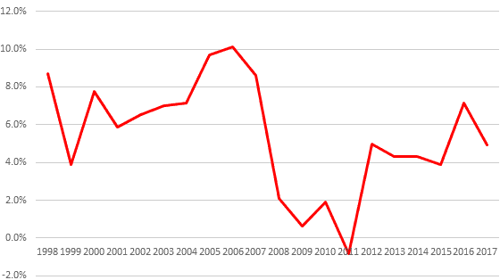 Figure 4: Growth in bank deposits during the year as a percentage of money supply at the beginning of the year (1998 to 2017)[5]