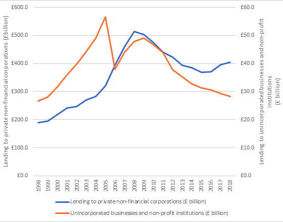 Figure 6: Financial institutions lending to private non-financial corporations and unincorporated businesses following the 2007 - 2008 financial crisis[7]