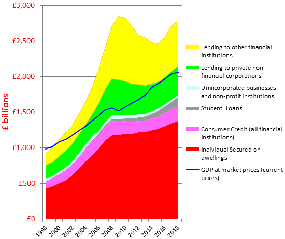 Figure 7: Net lending by all financial institutions by lending category, and relative to GDP (£billion)[9]