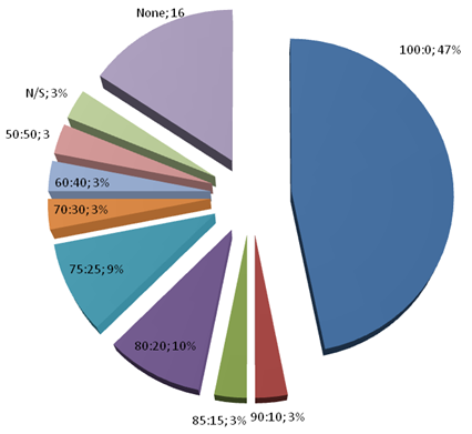 The dissertation module is given a weighting of 30 credits, thereby accounting for a quarter of the student’s final year of study. As shown in Figure 4, for Economics departments that offer dissertation options (84 per cent of our sample of departments do offer a dissertation), this is the most popular weighting applied.