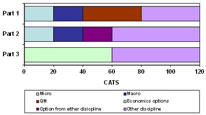 The structure of the curriculum is very clear. In Part 1, students take 1 unit each in micro and macro, and 2 units in quantitative methods (one in maths, one in statistics). The remaining credits are made up from optional units; students can take Introduction of Accounting and/or Globalisation and Development (20 CATS units), or can choose to take open units from elsewhere in the university (subject to timetable). These can be drawn from a wide range of other disciplines.