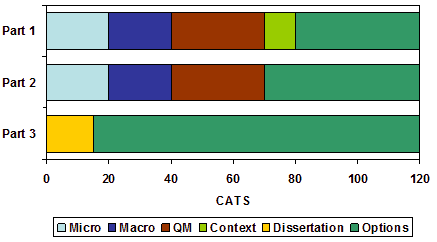 In Part 2, there are compulsory units in micro (20 CATS) and macro (20 CATS), together with either 2 units in quantitative economics (15 CATS each) or econometrics (also 15 CATS each). There is also a compulsory non-credit-bearing unit in careers skills. Remaining credits are then built up from Economics or from other schools, with individual options carrying 10 CATS. In Part 3, students undertake a dissertation or project (15 CATS) and then choose from a list of Economics options, each rated at 15 CATS.