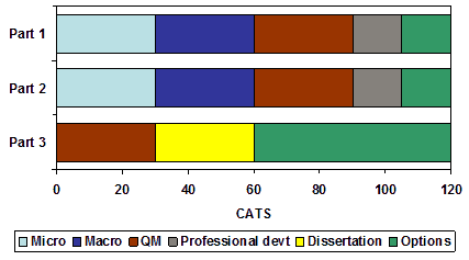 In Part 1, students take 30 credit units in micro, macro and QM, plus a 15 credit unit in Personal and Professional Development. For the final 15 credits, they choose between Banking and Finance in a Global Context or Introduction to Economic Institutions and Frameworks. In Part 2, the core is again contained in three 30-credit units in micro, macro and QM, and there is a 15 credit-rated unit in Professional Practice in International Business and Economics. The remaining 15 credits come from a selection of optional economics units. Part 3 is made up of a 30 credit unit in applied econometrics plus a 30 credit project, which may be theoretical or applied. Students then choose from a list of 30-credit options (the list also includes one 60-credit unit in the Economics of Regulation and Public Services).