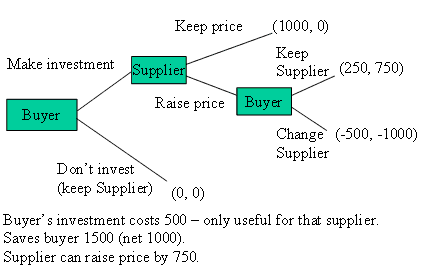 If no investment is made, both players get zero. The investment costs 500 and the gross value produced is 1500. In the initial contract all surplus goes to the Buyer and they get 1000 while the Supplier makes zero profit. The Supplier can hold up the Buyer by raising their price by 750 and leaving the Buyer with 250. The Buyer could change the Supplier, but this hurts everybody. The Buyer loses their investment and the Supplier loses all their business with the Buyer.