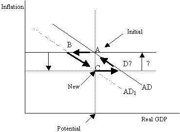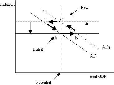 If inflation is regarded as being too low, point C in Figure 2 will not be the end of the adjustment process. The central bank will seek to inflate the economy, generating a path through point D and back to point A. Again output will overshoot but this time from below to above its potential. This possibility is not acknowledged by Taylor or Romer in their publications cited here (including Taylor’s textbook). In their analysis, point C is the end of the adjustment process.