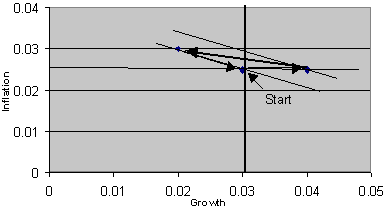 One might criticise this simulation method on the basis that, in practice, interest rate decisions are made in an environment of inherent uncertainty. Hence the central bank’s reaction function is determined in a less mechanistic way, reflecting judgement, experience, a feel for the data and so on, rather than as the solution to a loss-minimising problem. To capture this process, an alternative simulation exercise was conducted whereby the reaction function (2) was specified with exogenous values for the parameters σ1 and σ2 set initially equal to 2 and 0 respectively (σ2 = 0 implies an inflation-only target, which is the maintained assumption throughout the analysis in this paper). The resulting adjustment path, again for a positive demand shock, is shown in Figure 4. The path follows an elliptical pattern. The parameter values were chosen so that the path returns to its initial equilibrium point. However, simulations showed that this is a special case. There is a range of paths that do not return to the initial point; some are stable paths spiralling inwards and some are unstable paths that spiral outwards.