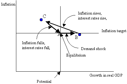 The modified forms of the IS curve (equation (1)) and the Phillips curve (equation (3)) are derived in the appendix. The result is that y in equations (1) and (3), and therefore equation (2), can simply be replaced by g, for growth, given some assumptions (see the appendix). The Phillips curve (equation (3)) then relates the change in inflation to the deviation of growth from potential instead of the deviation of output from potential. This is a valid short-run relationship in response to demand shocks. Equation (1) is no longer analogous to an IS curve. Instead it relates the growth rate to the interest rate. Substitution of (2) into (1), in their new forms, gives the growth rate of aggregate demand rather than its level. The shock, ηt, is interpreted as a demand growth shock, which more accurately represents the nature of demand shocks. The path of adjustment to a shock is exactly the same except that output is replaced by output growth. Hence, the analysis of the response to shocks carries over directly from inflation–output space to inflation–growth space. There is no added complexity, yet more realism and consistency (in having growth rates on both axes).