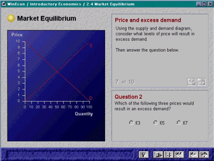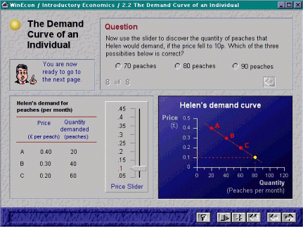 Moreover, the visual presentation employs teaching strategies based on the methods of phenomenography defined by Marton and Ramsden (1988). One such strategy is to present the learner with new ways of seeing a concept or principle (Marton and Ramsden, 1988). Diagrams in WinEcon are built up step by step. For example, in the plotting of the demand curve, a table depicting the relationship between price and quantity demanded is first presented (see Figure 2). The X–Y Cartesian of quantity demanded against price is situated next to the table. As the student clicks on each of the coordinates in the table, the corresponding point is being plotted on the graph. After all the points are plotted, a line is drawn through all the points to show the individual demand curve. WinEcon allows students to discover how the curve is built up rather than being presented with the completed diagram (Lim, 2001a).