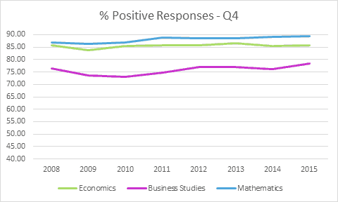 As the National Student Survey has recently opened for 2016, we thought it might be interesting to look at the development of results in economics over the last eight years and how it compares to related disciplines. The results below report overall satisfaction and selected questions from the Teaching and Assessment & feedback sections.