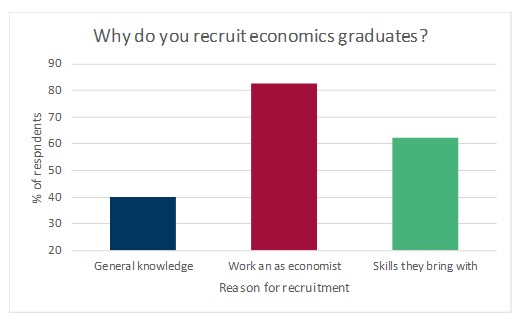 When asked why they hire economics graduates, the most common answer given by the employers is ‘they will work as an economist’, followed by ‘skills they bring with them’ and ‘general knowledge and understanding of economics is useful’ (please note that respondents can give more than one reason).