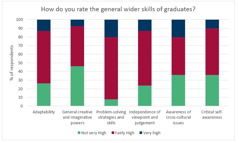 There are numerous skills for which over one third of respondents believe economics graduates’ skills are ‘not very high’: ‘general creative and imaginative powers’ is the most common at 46.2%, and ‘the ability to communicate clearly in writing’, ‘awareness of cross-cultural issues’ and ‘critical self-awareness’ are all rated ‘not very high’ by 35.9% of employers. The ‘ability to apply to what has been learned in a wider context’ also scores poorly, with 30.8% responding ‘not very high’ and just 12.8% replying ‘very high’. This is alarming given that application of knowledge is consistently rated as one of the most important skills for economics graduates to have by both employers (evidence from this survey and previous surveys by the Economics Network).