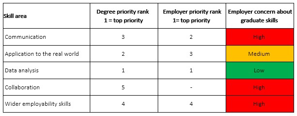 On communication, the focus is on traditional academic writing in degrees whereas employers are looking for both written and presentation skills aimed at non-expert audiences. Similarly, for collaboration economics departments focus, albeit in a limited way, on working with other economists whereas employers are looking for graduates who are confident working with colleagues from any discipline.