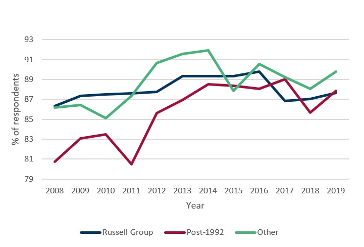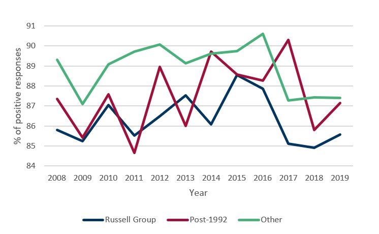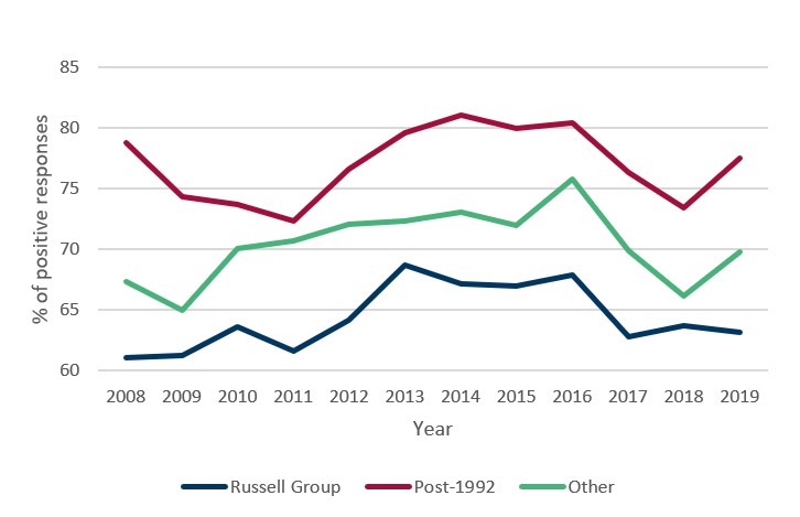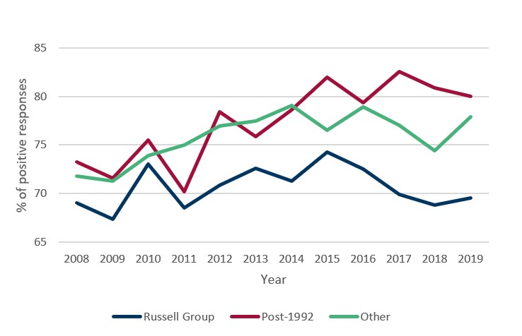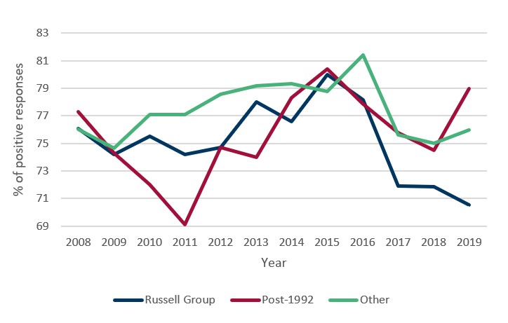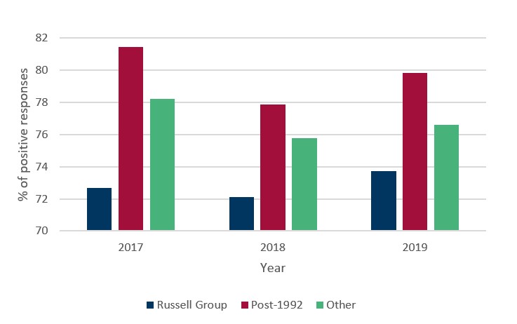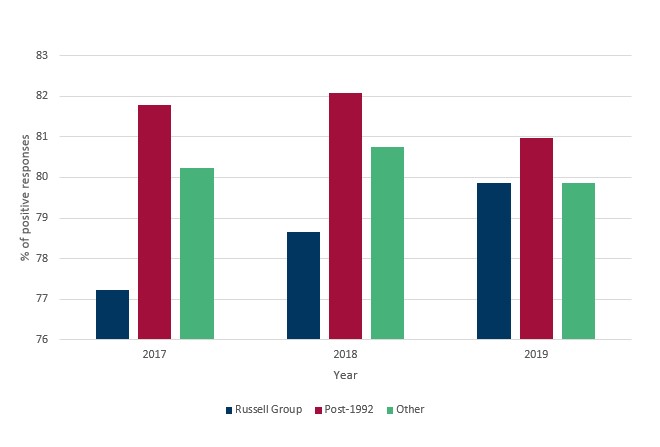 ‘Post-1992’ universities obtain the highest positive response rates for 2018 and 2019, while ‘Russell Group’ universities receive the lowest scores in all three years.