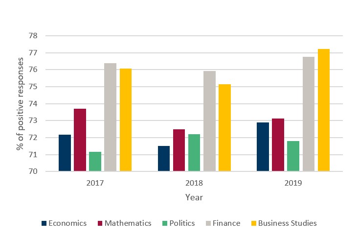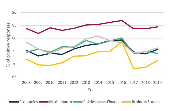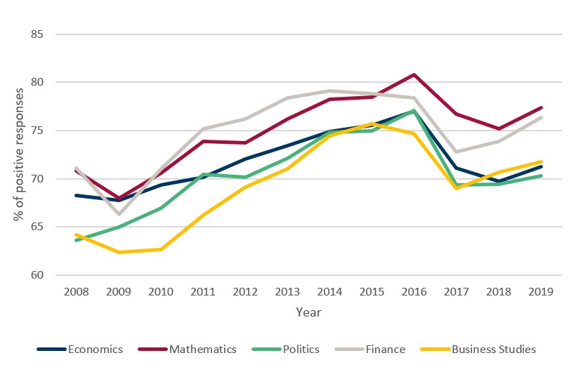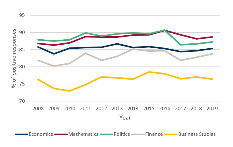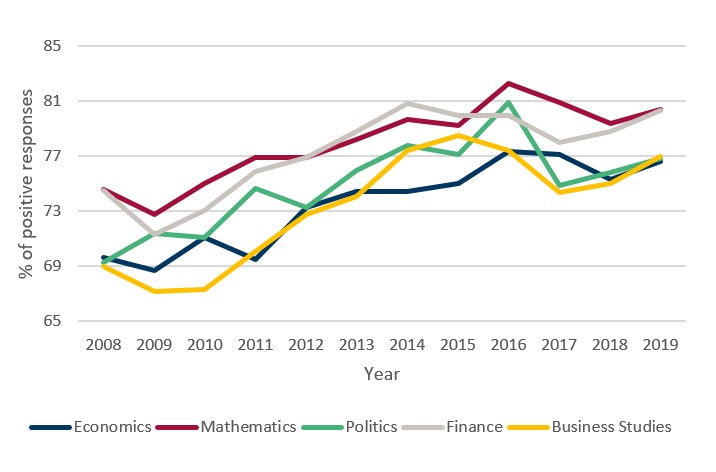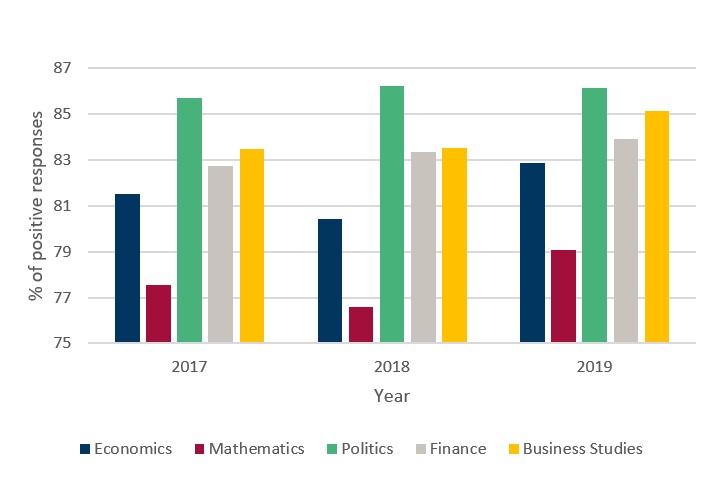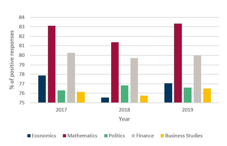 Economics scores are similar in all three years, at 80.0% in 2017, 80.7% in 2018 and 80.3% in 2019. Positive response rates increase in 2019 for mathematics, politics and business studies, with finance seeing a small decrease to 79.9%. Politics attains the highest score in all years by some margin, with a score of 86.2% in 2019. This is 4.5pp higher than the next ranking subject (business studies).