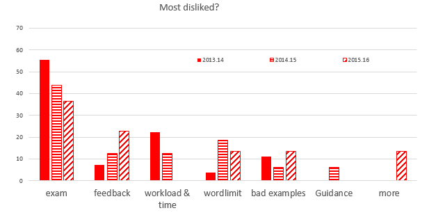 Figure 1d, shows that the link between the CA and the exam is also the most problematic issue, voted by 36-53% of students, although this figure has fallen over time. Further, 10-20% of students complain about workload and time constraints associated with CA. This figure, also highlights that there is room to improve staff-student communication, as 7-23% of students disliked the feedback received. To tackle this problem, I have created a mark-sheet that provides positive, negative and forward guidance more explicitly. A small proportion, 10%, of students find that readings are inappropriate, although this contrasts with the 45-63% of students that claimed CA readings are useful see the theory-reality link in Figure 1c. This could reflect that students with different learning approaches seek different things in feedback (Rowe and Wood, 2008).