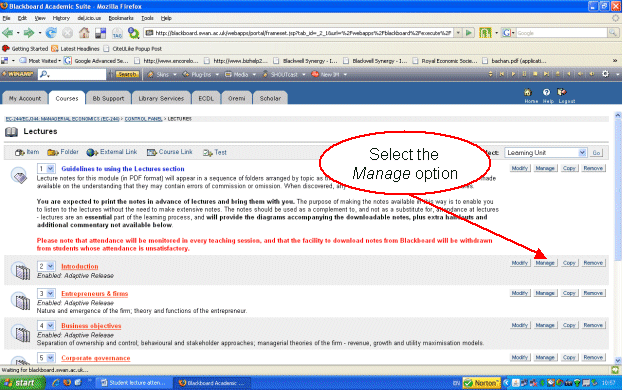 The next step is for each set of lecture notes (or other materials) you want to make available selectively, to configure the 'Adaptive Release' settings so as to restrict who can access them to those in the group only. This is done from the Control Panel location where your lecture notes reside, and selecting the Manage option (Fig. 1) (note 4).