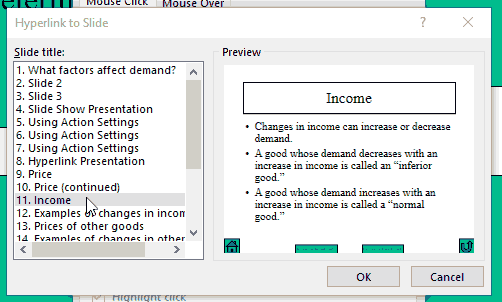This hyperlink approach to PowerPoint builds in flexibility to the lecture and allows the students and the professor together to pick and choose which topics to cover on a particular day. For example, suppose that the laws of supply and demand are being covered. Under the slide show method, the professor might decide to cover price and the law of demand and then show how income and then tastes then expectations about future prices, etc. shift the demand curve itself. Under the hyperlink method, the lecture can be built around the central question of "What factors affect demand for goods?" A home page with active buttons leading to short topics such as income effects, tastes, expectations about future prices, etc. is created. Instead of the professor deciding order and depth to which to cover the topics being discussed, this method encourages active learning since the students themselves can choose the course of the lecture. In addition, students viewing this type of presentation are more likely to pay close attention since the class will cover the topics in which the students are most interested.