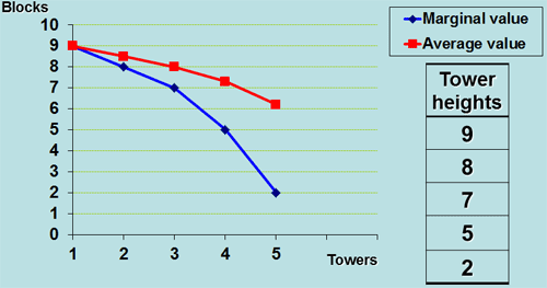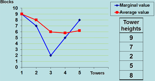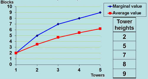 | Tower number | Height of this tower (in blocks) | Total height so far | Average height (blocks per tower) | Marginal height (in blocks) |