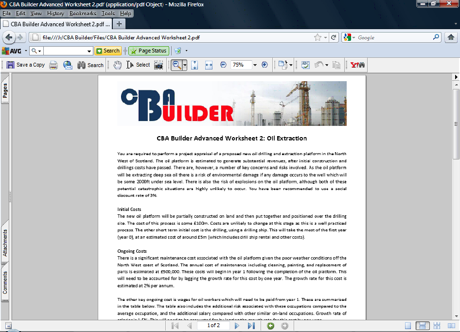 The resource is available at www.cbabuilder.co.uk. Following the original objectives, the resource contains an online textbook, flash animations, and a detailed links section containing links to relevant textbooks, journal articles, and web resources. The site also includes CBA Builder Simple and Advanced Excel-based CBA construction tools. CBA Builder Simple allows users to construct a CBA using a number of separate tabs, and is particularly suitable for teaching and learning applications. CBA Builder Advanced allows more detailed CBAs to be constructed. CBA Builder Advanced is therefore suitable for more in-depth practical applications of CBA, or more advanced teaching and learning applications. The CBA Builder tools allow users to enter one-off costs and benefits, recurring costs and benefits, discount to present value, compound values, produce results (NPV, BCR), perform discount rate sensitivity analysis, and perform CBA period sensitivity analysis (see screenshots 2-5). Finally, the resource includes a series of downloadable exercises and worksheets, many of which are designed for use with the CBA Builder Simple and Advanced tools (see example in screenshot 6 and 7).